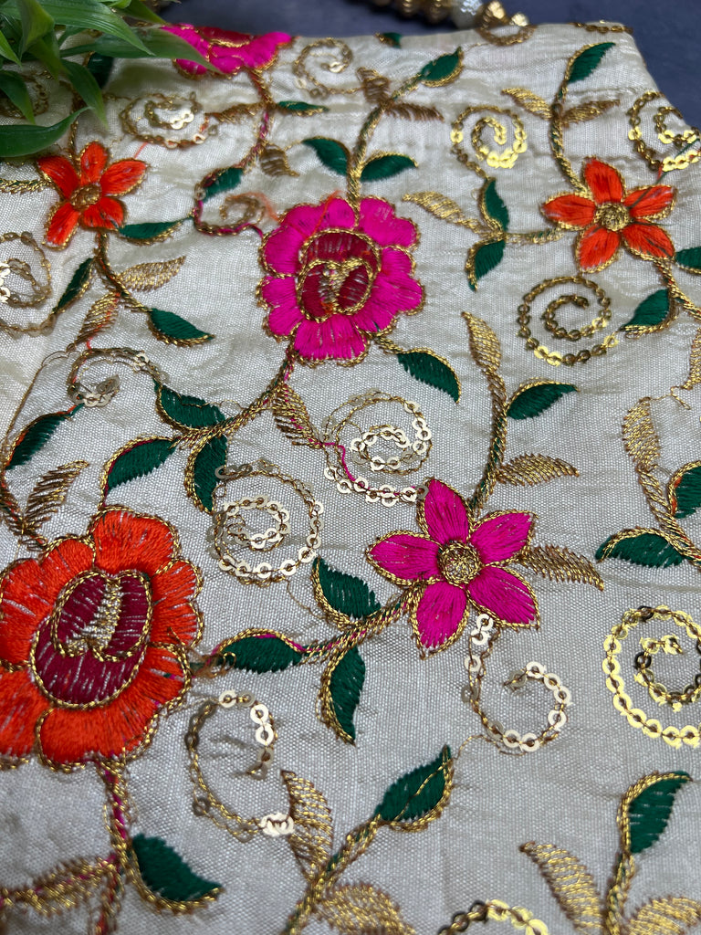 Elegant and timeless, this multi coloured embroidered potli bag features intricate gold detailing on a soft champagne base. Designed with a classic diamond pattern and finished with a beaded handle and tassel drawstrings, it’s the perfect accessory for weddings, festive events, and special occasions.
